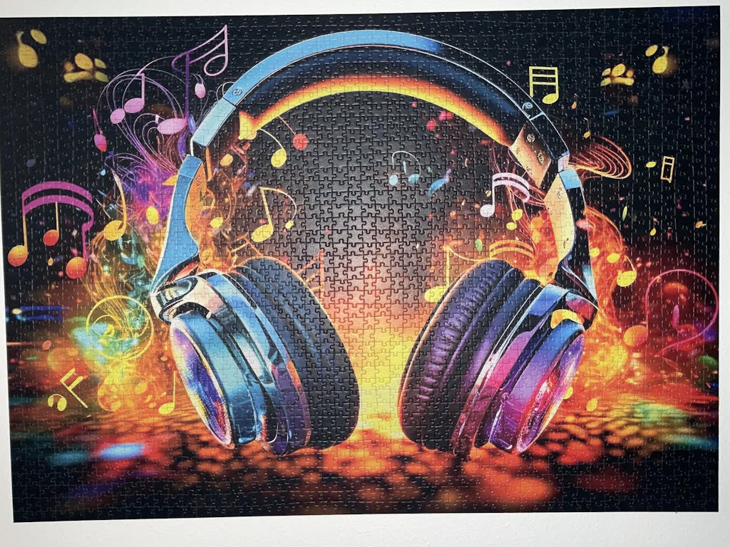 Entdecken Sie ein lebendiges 2000 Teile Puzzle zum Thema Musik: Markante Farben und Musik-Symbole im Kontrast zum schwarzen Hin...